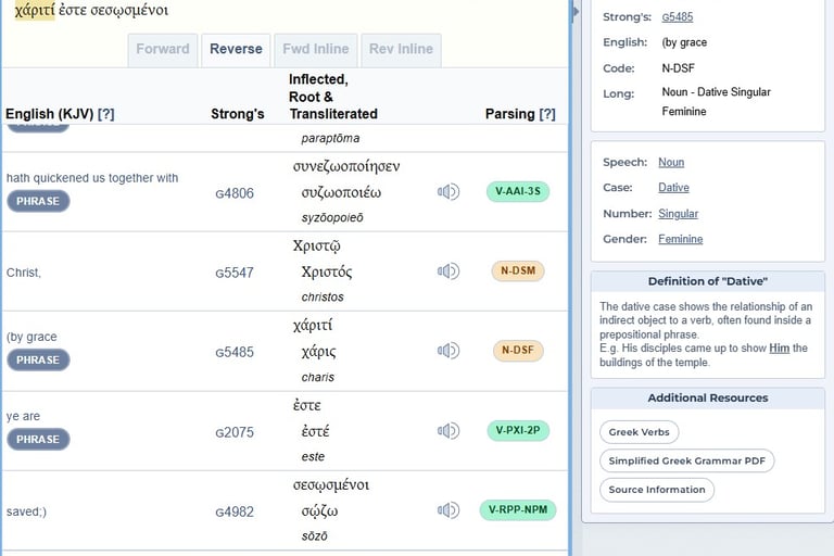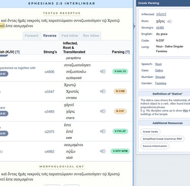 We've already introduced the Blue Letter Bible Interlinear tool. Let's talk about a feature that may prove useful. This is a screenshot of what you'd see if you opened the interlinear tool from Ephesians 2:5. Notice the "Parsing" column.